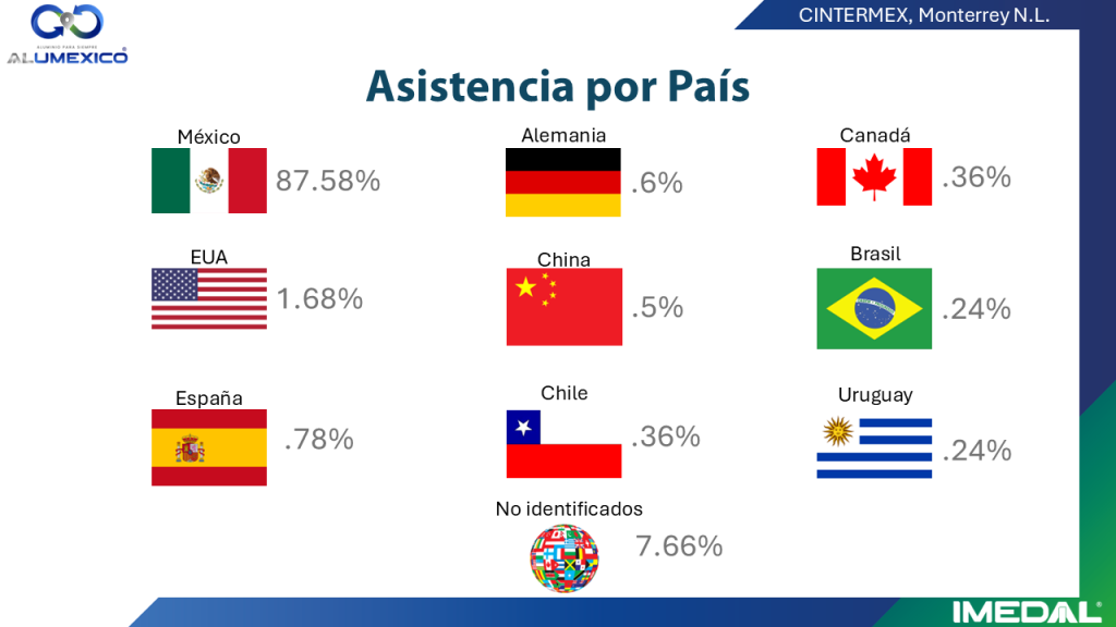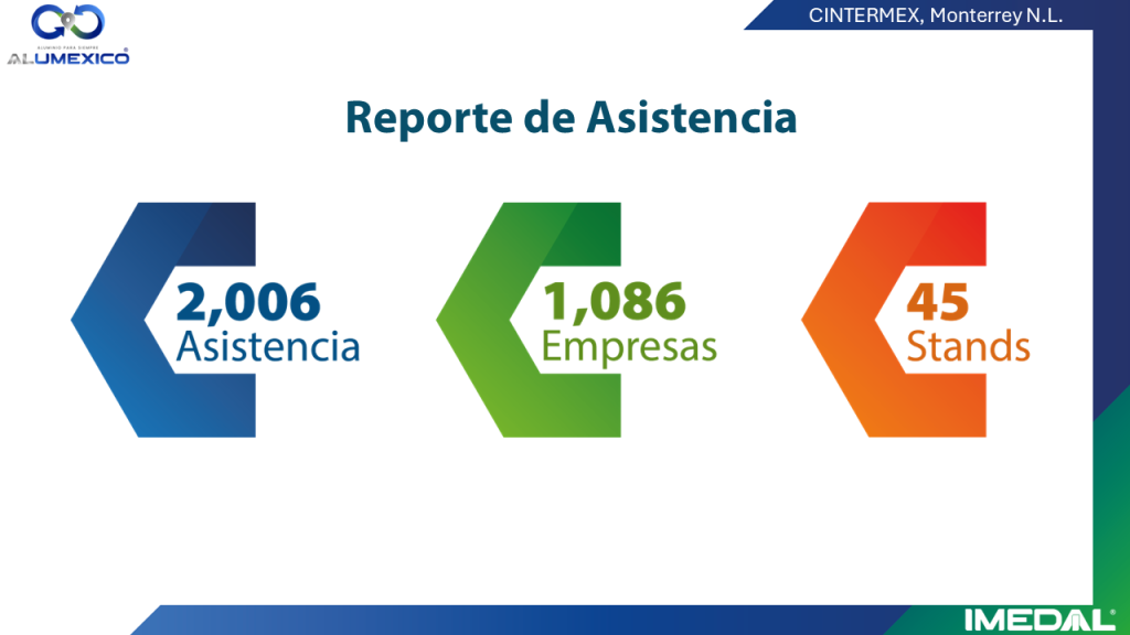 Con una asistencia destacada de participantes de México y el extranjero, ALUMEXICO 2025 ofreció un programa integral que incluyó conferencias magistrales, técnicas y comerciales, abordando temas clave como el panorama global del mercado, tendencias económico-políticas, innovación en procesos de producción, sostenibilidad, aplicaciones del aluminio en la industria automotriz y nuevas tecnologías aplicadas al sector.